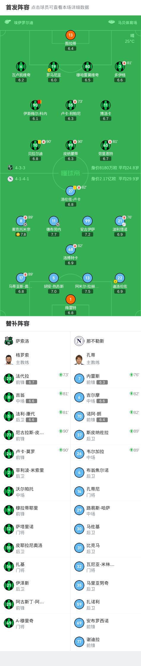 北京时间8月24日意大利足球顶级联赛第1轮,萨索洛主场对阵那不勒斯。上半场,波利塔诺助攻麦克托米奈头球破门,麦克托米奈弧线球兜射中楣;下半场,波利塔诺打门变线中柱,德布劳内任意球破门打进意甲处子球,科内犯规累积两黄变一红被罚下。最终比分萨索洛 0-2 那不勒斯。
